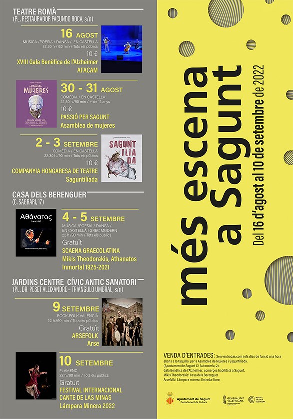 Por un lado, en la programación del Ayuntamiento de Sagunto, bajo el nombre de Més Escena a Sagunt en el Teatro Romano se presentarán 3 espectáculos. El primero de ellos es la XVIII Gala Benéfica del Alzheimer organizada por AFACAM en la que habrá música, poesía y danza. Es apto para todos los públicos, el evento tiene una duración de 120 minutos y su entrada tiene un coste de 10 euros. En segundo lugar, será Passió per Sagunt la encargada de llevar a cabo el espectáculo Asamblea de Mujeres, los días 30 y 31 de agosto. Se trata de una comedia, que se interpretará en castellano, con una duración de 90 minutos. Está pensada para mayores de 12 años y las entradas tienen un precio de 10 euros. El tercero se trata de Saguntilíada, de la compañía Hongaresa de Teatre, que se llevará a cabo los días 2 y 3 de septiembre. Tendrá una duración de 90 minutos, está pensado para todos los públicos y su entrada tiene un precio de 10 euros. Todos los eventos tendrán lugar a las 22.30 horas.