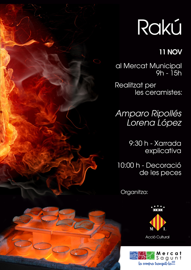 El próximo sábado, 11 de noviembre, se llevará a cabo un Raku, es decir, un taller de cerámica tradicional de la mano de las ceramistas locales Amparo Ripollés y Lorena López. La jornada comenzará a las 9 horas en las instalaciones del Mercado Municipal de Sagunto, y será a cargo de Acción Cultural, un nuevo concepto que surge fruto de una iniciativa de la concejalía de la Universidad Popular.
