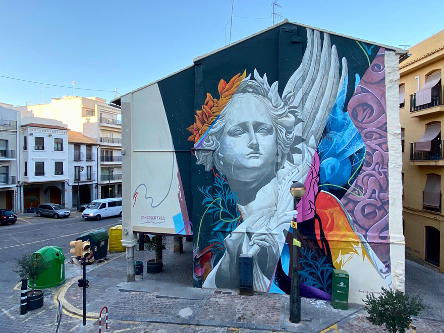 En él, Kraser ha pretendido plasmar la memoria histórica universal mediante la reinterpretación actualizada de la escultura grecorromana. Según el artista «he querido hacer la representación contemporánea de la diosa griega Niké o también conocida por los romanos como Victoria». El mural tiene como elemento principal a la diosa alada que observa atentamente a la población del entorno más antiguo de Sagunto, «como si nos dijese que no deberíamos olvidar nuestro pasado, pero también nos invita a conocerlo y se despide observándonos atentamente en el descenso de la principal vía de acceso a un enclave inolvidable como es Ciutat Vella». Representada como es habitual con la corona de laurel y la palma en mano, «estos elementos se desfragmentan en abstracciones y composiciones de colores en perfecto equilibrio, proporción y armonía, pero nunca perdiendo la esencia en la ejecución de la propia imagen», concluye el artista.