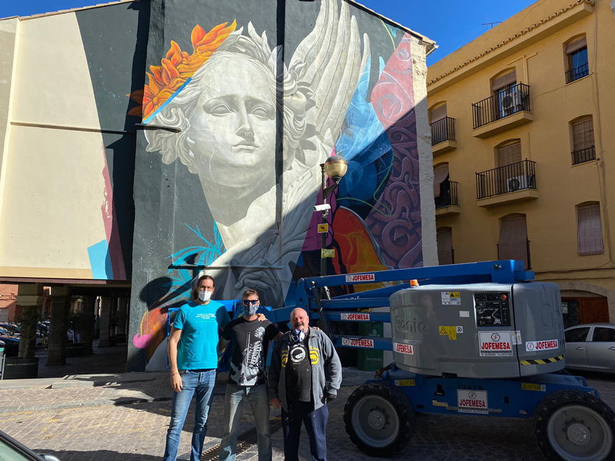 El festival de arte urbano Més Que Murs, organizado por la Concejalía de Juventud e Infancia del Ayuntamiento de Sagunto, llega al ecuador de la edición de 2020 con el mural que el artista murciano Kraser ha realizado en la esquina de la plaza Mayor con la calle Castillo.