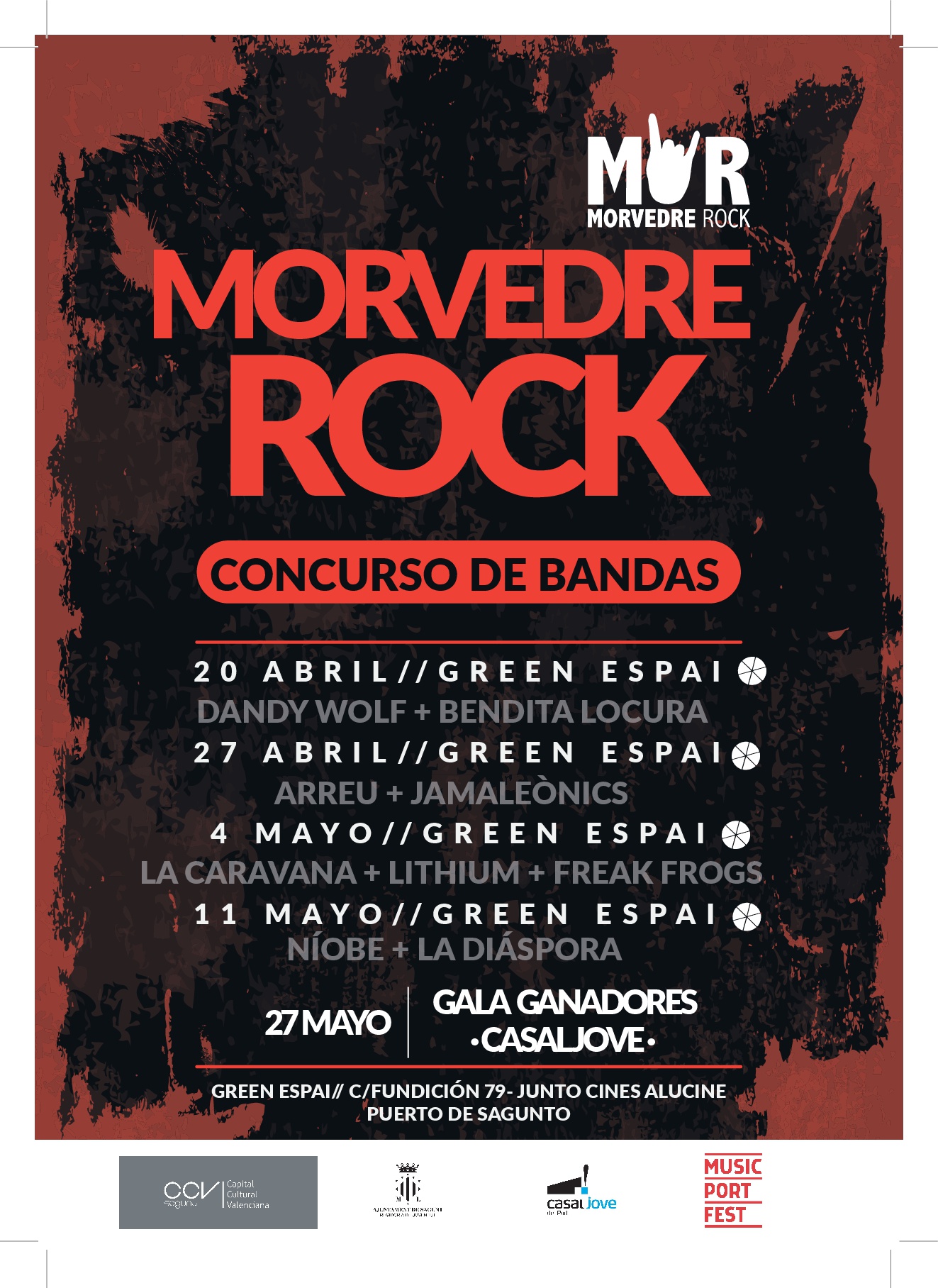 Este próximo viernes 20 de abril, a las 23.30 horas, arranca el Morvedre Rock 3.0 con el grupo indie castellonense Dandy Wolf y el grupo local Bendita Locura, cuyo rock lleno de vida está dando mucho que hablar. El viernes 27 de abril, a la misma hora, llegará la banda Arreu, del norte de la Comunidad Valenciana, mezclando rock, ska, reggae y rap con letras en valenciano en su mayoría y con un punto de vista de compromiso social. Junto a ellos estará Jamaleònics, un grupo de jazz rock y funk formado por jóvenes músicos de Sagunto y de pueblos de los alrededores.