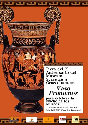 El sábado 18 de mayo, a partir de las 20 horas, tendrá lugar la celebración de la Noche de los Museos en la sala I del Museo de la Escena Grecolatina. Durante esta segunda actividad se presentará una réplica del Vaso Pronomos, una pieza de cerámica perteneciente al Museo Arqueológico Nacional de Nápoles en el que aparece la figura del dios Dionisio y de la diosa Ariadna.