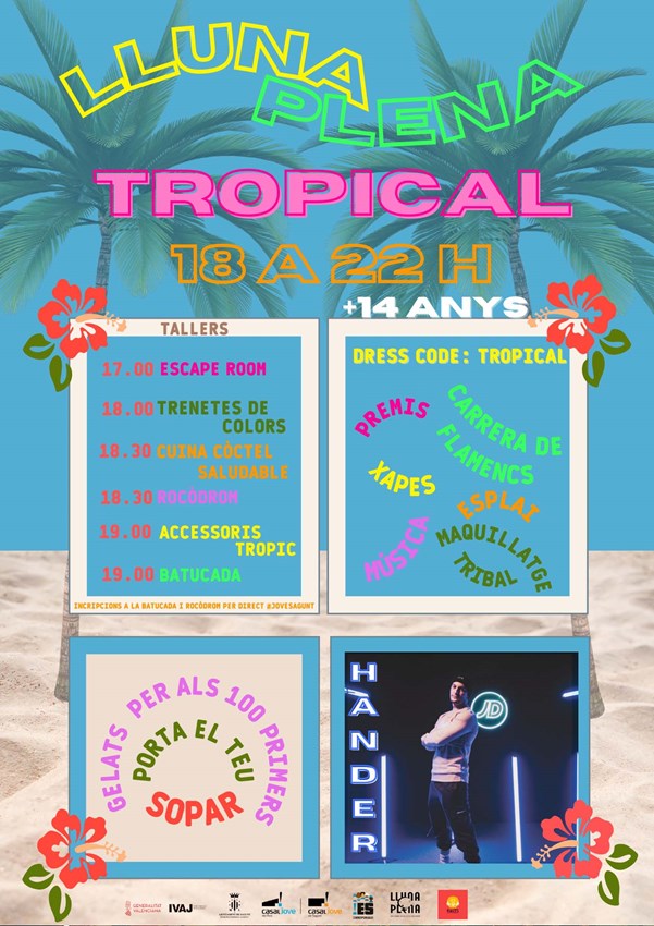 Con el dress code y la ambientación tropical, esta Lluna Plena mensual contará con talleres muy veraniegos donde la población joven que acuda podrá aprender a hacer trenzas de hilo de 18 a 19 horas, a hacer cócteles saludables de 18.30 a 20 horas, y accesorios tropicales de 19 a 20 horas. Para los más aventureros también habrá un taller de escalada de 18.30 a 20.30. Las inscripciones a este taller se realizarán por mensaje directo a Instagram de @jovesagunt.