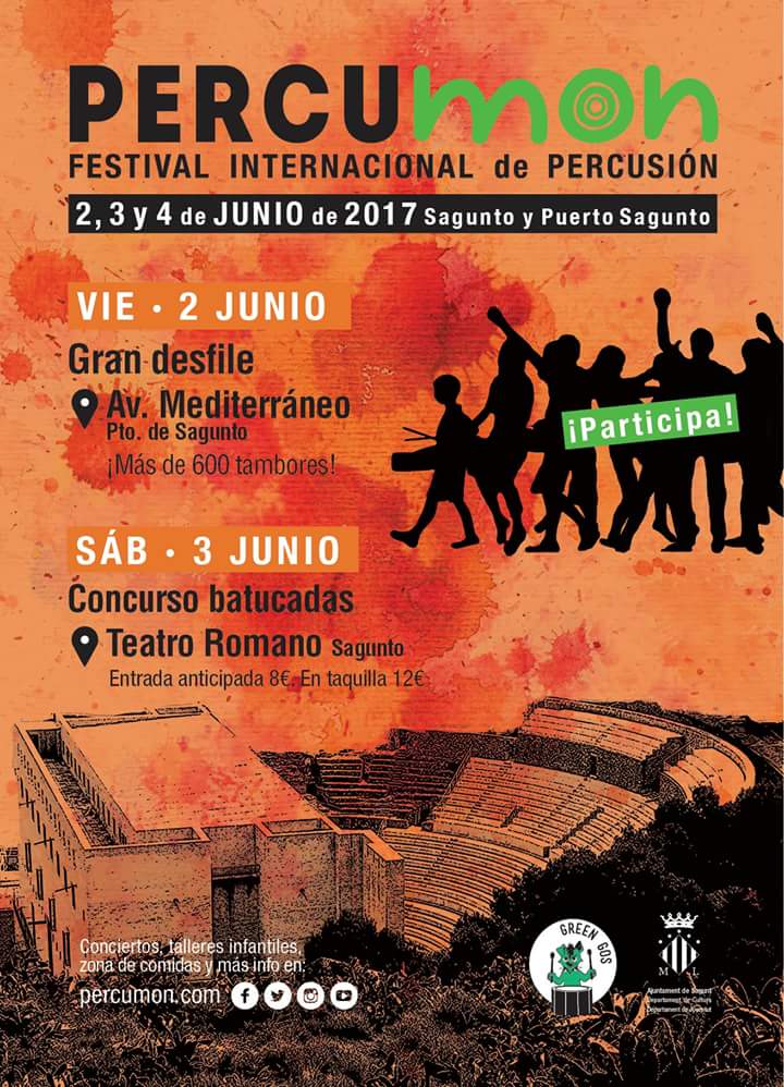 La segunda edición del Festival Internacional de Percusión Percumon llegará a Sagunto y Puerto de Sagunto el 2, 3 y 4 de junio. Organizado por Espectáculos HM Producciones y el grupo de batucada Green Gos en colaboración con las concejalías de Juventud, Cultura y Turismo del Ayuntamiento de Sagunto, el festival contará con un gran desfile de batucada, exposiciones, una mesa redonda, talleres y una serie de conciertos con bandas como Samborejo Band, Coco Malangao, Funkiwis o Mafalada, entre otras. En esta edición, el festival tendrá un carácter reivindicativo, ya que girará en torno a la crisis de refugiados que sufre Europa, el cual quedará reflejado en las diferentes actividades.