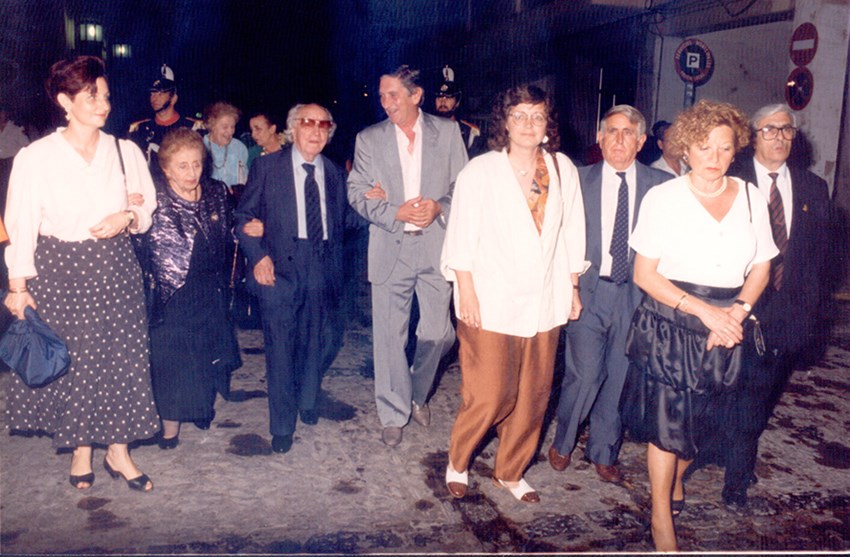 Foto de archivo. Joaquín Rodrigo y su mujer, Victoria Kamhi, en su visita a Sagunto por el homenaje del 50 aniversario del Concierto de Aranjuez (1990).