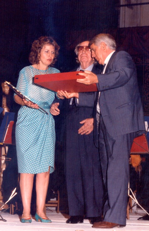 Foto de archivo: Joaquín Rodrigo recibe del alcalde de Sagunto, José García Felipe, una placa de parte del Ayuntamiento de Sagunto y la Conselleria de Cultura en el acto de homenaje por el 50 aniversario del Concierto de Aranjuez (1990).