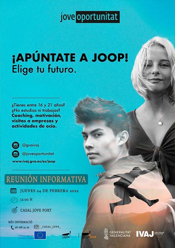 El próximo jueves, 24 de febrero, tendrá lugar la reunión informativa del programa Jove Oportunitat (JOOP), un curso donde el objetivo es orientar tanto personalmente como profesionalmente a las personas jóvenes de entre 16 y 21 años para ayudarles a construir su proyecto global de vida. La reunión será a las 12.00 horas en el Casal Jove de Puerto de Sagunto.