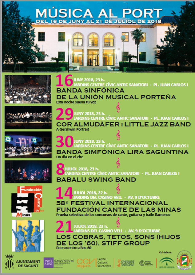 Música al Port finalizará este próximo sábado 21 de julio a las 23 h, en los jardines del Casino de Puerto de Sagunto. El concierto contará con los grupos Los Cobras, Tetos, Sons (Hijos de los ´60) y Stiff Group, que nos trasladarán a la música de los años 60.
