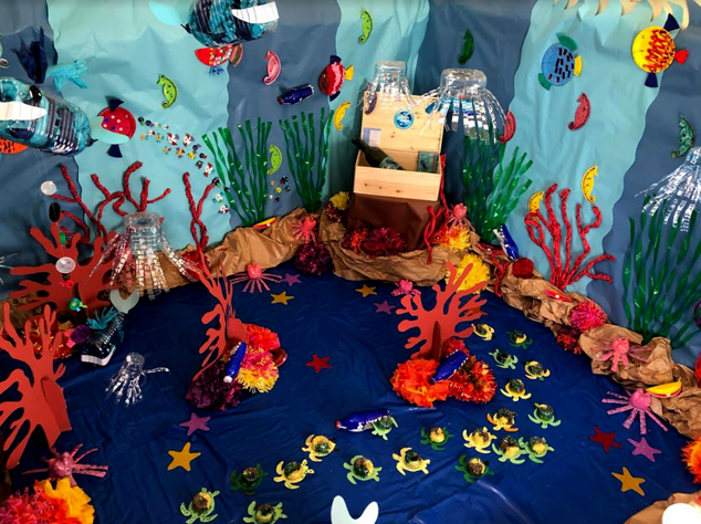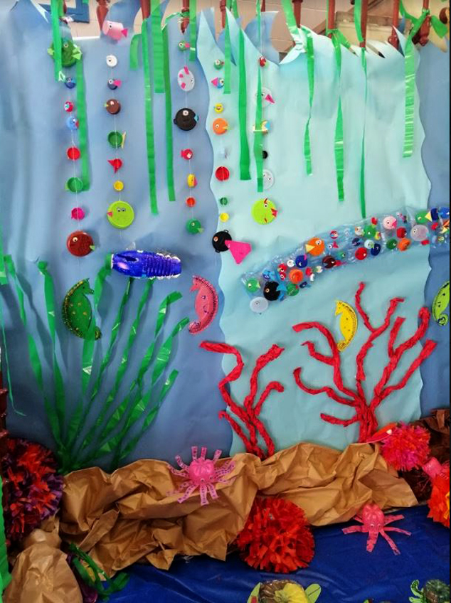 Los estudiantes del primer colegio en recibirlo, el CEIP Cronista Chabret, han decorado un espacio en su centro dedicado al mundo marino, en el que todos los elementos simulan animales y plantas acuáticas, realizados todos ellos con material reciclado. Los escolares han transformado garrafas de agua en caparazones de tortugas marinas, botellas en medusas y platos desechables en caballitos de mar.