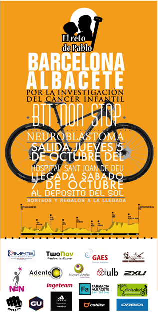 “El Reto de Pablo” consiste en un recorrido de 650 Km que realizará José Luís López desde Barcelona hasta Albacete, y que pasará por Sagunto el viernes 6 de octubre por la tarde en el pabellón René Marigil. Al ser una modalidad “non stop”, prácticamente sin bajar de la bicicleta, el recorrido se hará durante 48 horas y saldrá desde el hospital Joan de Déu en Barcelona, donde estuvo ingresado Pablo, hasta llegar a Albacete el sábado 7 sobre las 14.00 h. Esta oportunidad surgió de la iniciativa “Persigue tus Sueños” de Gaes, a quienes presentó José Luis el proyecto para poder conseguir la financiación y llevar a cabo “El Reto de Pablo”.
