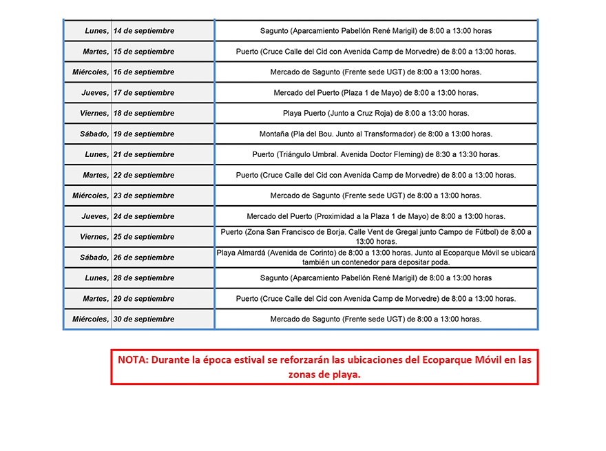 Durante el mes de septiembre los servicios que prestan los ecoparques móviles estarán ubicados en zonas de Sagunto, Puerto de Sagunto, playa de Almardà y zonas de montaña, en el horario de 8 a 13 horas. De forma concreta, en Sagunto esta instalación estará el 28 de septiembre y, durante los días de mercado exterior, 16; 23 y 30 de septiembre, frente de la sede de la Unión General de Trabajadores (UGT).