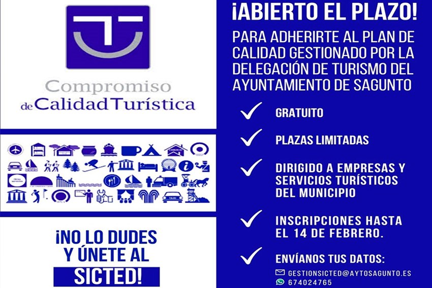 El proceso de adhesión de las nuevas empresas y servicios ha comenzado para todas aquellas que quieran participar en SICTED Sagunto 2023. El plazo estará abierto hasta el martes 14 de febrero y la inscripción es totalmente gratuita, ya que los gastos derivados del proyecto están financiados por la Conselleria de Turisme y el Ayuntamiento de Sagunto.