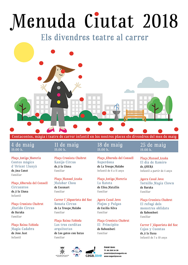 El viernes 25 de mayo a las 19 horas se interpretarán simultáneamente: El día de Ramiro, por AMEBA en la plaza Manuel Azaña; Tornillo Magia Town, por Baraka en el Ágora del Casal Jove; El refugi dels monstres oblidats, por Rebombori en la plaza Cronista Chabret; y Cajas y cuentas, por A la Lluna en la calle l’Alquerieta del Roc.