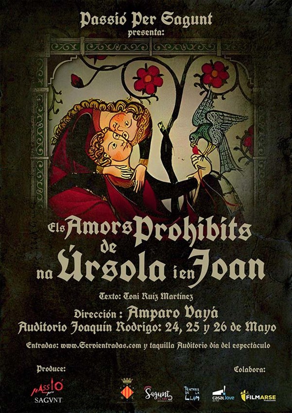 Este viernes, sábado y domingo, que son 24, 25 y 26 de mayo, a las 20:30, a las 20 y a las 19 horas respectivamente en el Auditorio Joaquín Rodrigo de Sagunto, Passió per Sagunt interpretará Els amors prohibits de Na Úrsola i En Joan. Esta obra, que tiene una duración de 90 minutos, está coproducida por el Ayuntamiento de Sagunto y parte del texto en valenciano con tintes celestinescos de Toni Ruíz y la adaptación y dirección de Amparo Vayá.