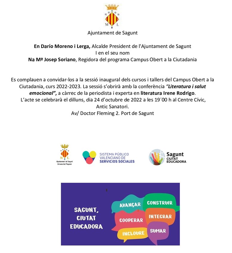 La inauguración del curso será el lunes, 24 de octubre en el Centro Cívico a las 19 horas con la conferencia Literatura y bienestar emocional de Irene Rodrigo, colaboradora de Àpunt.