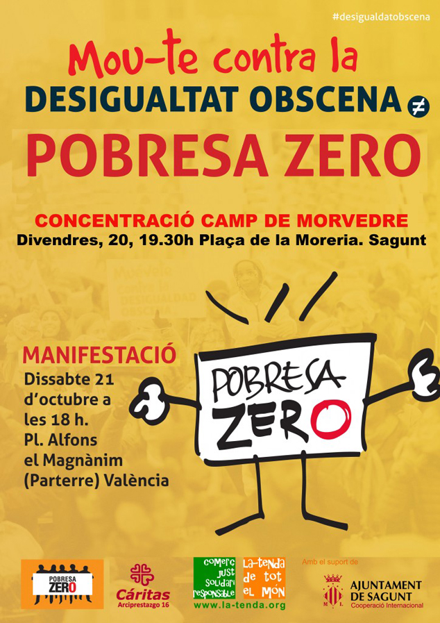 Desde La Tenda de Tot el Món hacen un llamamiento a la ciudadanía y a las entidades comarcales para participar. Además, mañana sábado, 21 de octubre, será la manifestación de Pobreza Cero en Valencia. “Muévete contra la desigualdad obscena” es el lema que se oirá en el evento. La convocatoria de la Coordinadora Valenciana de ONGD y la plataforma valenciana Pobreza Cero, de las que forma parte la ONGD La Tenda de Tot el Món, es a las 18.00 h desde la plaza Alfons el Magnànim.