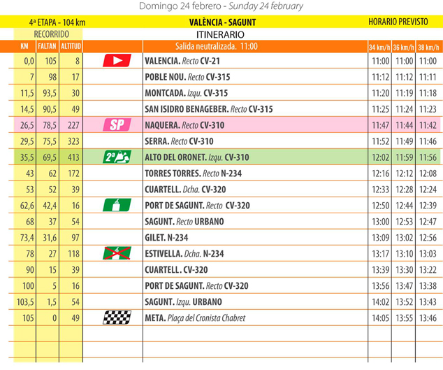 El recorrido de la cuarta etapa será el siguiente: Valencia, Poble Nou, Moncada, San Isidro de Benagéber, Náquera, Serra, Alto del Oronet, Torres Torres, Cuartell, Puerto de Sagunto y Sagunto, donde tendrá lugar la meta.