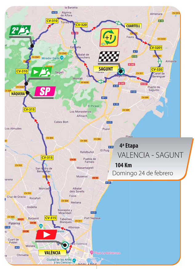 Esta es la cuarta y última etapa de la tercera edición de la Semana Ciclista Valenciana - Vuelta Comunidad Valenciana Féminas. La salida será desde Valencia y tendrá un recorrido de 104 km, que finalizará en la plaza Cronista Chabret de Sagunto. Asimismo, los organizadores han informado que habrá una pantalla gigante, situada en la meta, para seguir la retransmisión de la vuelta ciclista en streaming. Aproximadamente la hora de llegada a Sagunto será sobre las 12.30 horas por el hospital.