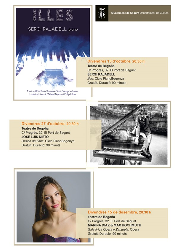 La concejala de Cultura, Ana María Quesada, ha manifestado que el empeño de su departamento, así como el del Ayuntamiento de Sagunto es promover, dar a conocer y hacer accesible a toda la ciudadanía el talento local: «Esta semana podremos disfrutar de un concierto en el maravilloso piano que tenemos en el Teatre de Begoña, a cargo de Sergi Rajadell. Como él mismo me comentaba el otro día, es un concierto muy personal en el que nos va a mostrar música clásica, pero de autores contemporáneos».
