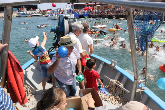La actividad ha contado con la presencia del alcalde accidental, Pepe Gil; la concejala de Fiestas, Asun Moll; y otros miembros del gobierno que además de participar en la entrega de premios de la travesía a nado, también han colaborado en el lanzamiento de pelotas de goma al agua.