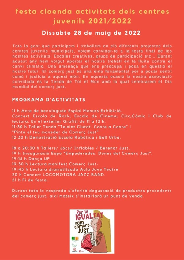 Así, a las 11:00 horas será el acto de bienvenida que dará el pistoletazo de salida a la jornada con una exhibición del Esplai Menuts. Se sucederán un concierto de la Escuela de Rock y muestras de las escuelas de cine, circo y cómic así como actividades del Club de Lectura y de grafiti en el exterior. También habrá talleres de comercio justo y demostraciones de las escuelas de robótica y de baile urbano.
