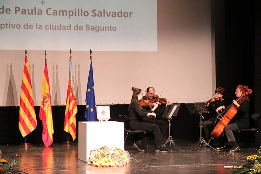 Francisco de Paula Campillo Salvador, que reside en Sagunto desde hace más de 55 años y se ha dedicado intensamente a tareas sociales y empresariales en el ámbito de la agricultura comarcal, fue homenajeado ayer en el Centro Cultural Mario Monreal con motivo del reconocimiento de Hijo Adoptivo de la Ciudad de Sagunto. En el evento actuó también un grupo de cámara.
