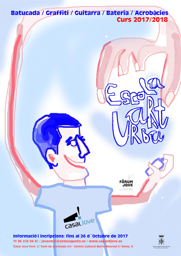 La concejalía de Juventud del Ayuntamiento de Sagunto ha puesto en marcha la Escola d’Arts Urbanes, un espacio de formación en actividades creativas de carácter eminentemente urbano dirigido a menores y jóvenes. La idea es impartir una serie de talleres anuales relacionados con la música, las artes plásticas y la danza. En la presente edición, que se plantea desde un punto de vista experimental, se realizarán talleres de batería, grafiti, guitarra, batucada y un set de formación para jóvenes donde se tratarán diversas disciplinas (UrbaMIX), desde el grafiti hasta la fotografía y las acrobacias aéreas.