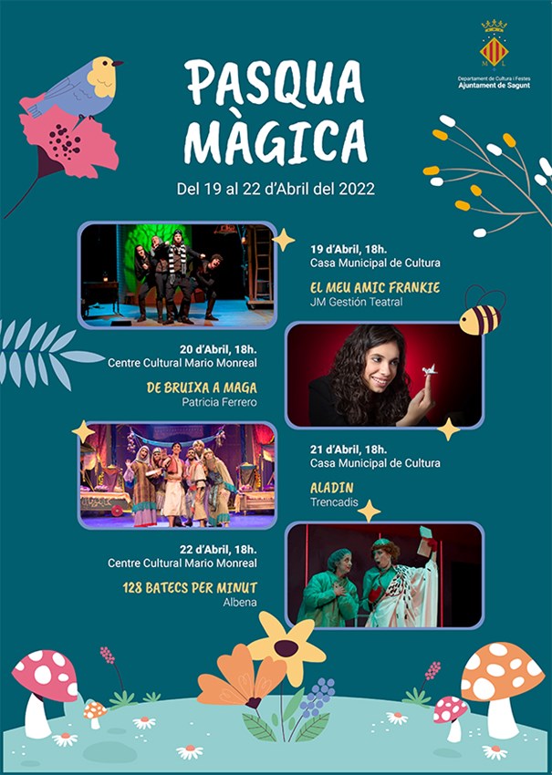 Vuelve la Pascua Mágica, la iniciativa que ponen en marcha conjuntamente los departamentos de Cultura y de Fiestas y Cultura Popular del Ayuntamiento de Sagunto pensada para el público infantil y juvenil con motivo de las vacaciones de Semana Santa. La edición de este año, que empieza hoy, martes, y que durará hasta el jueves, ofrece cuatro espectáculos para todos los públicos en los cuales habrá teatro, musicales y magia con entrada gratuita para niños, niñas y acompañantes hasta completar el aforo, sin necesidad de retirar previamente las localidades. Todos los acontecimientos tendrán lugar a las 18.00 horas.