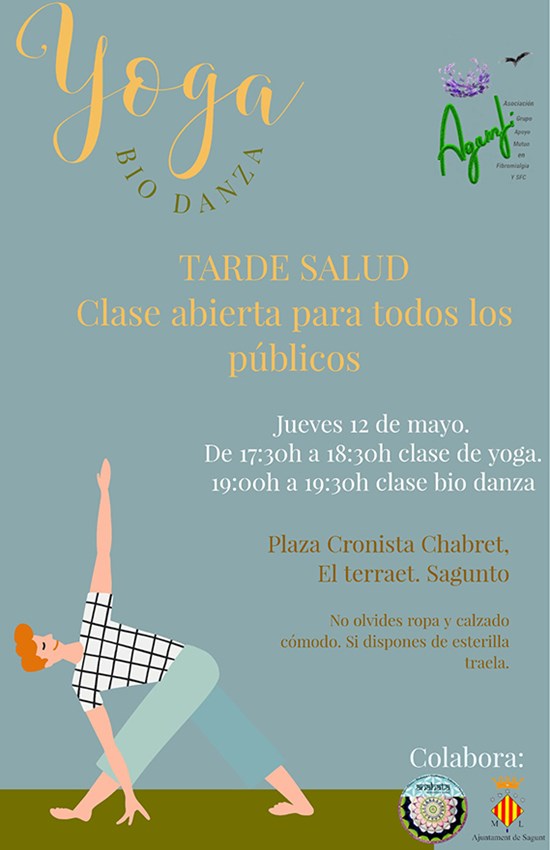 La Tarde de salud tendrá lugar en el terraet de la plaza Cronista Chabret de Sagunto. De 17:30 a 18:30 horas será la clase de yoga, mientras que de 19:00 a 19:30 horas será la de biodanza. Desde la organización recomiendan a las personas participantes acudir con ropa y calzado adecuados y esterilla.