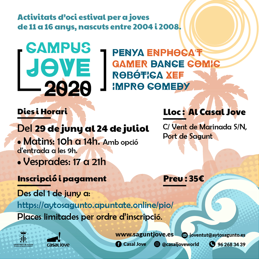 La concejalía de Juventud e Infancia del Ayuntamiento de Sagunto ha abierto hoy el plazo de inscripción para el Campus Jove 2020, una especie de escuela de verano dirigida a jóvenes de entre 12 y 16 años. Esta delegación ofrece del 29 de junio al 24 de julio ocho campus englobados en el Campus Jove 2020, que permitirán acercarse a ocho mundos diferentes, pero igual de atractivos, a aquellas personas que durante el verano busquen el momento idóneo para practicar sus actividades favoritas.