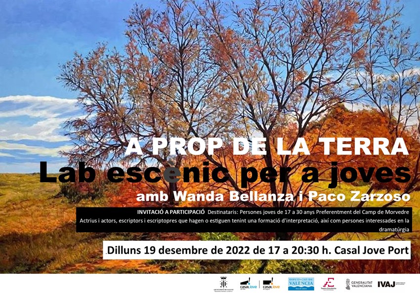 Después del éxito de la pasada edición del Lab Escénico ‘El tiempo arrebatado’, recientemente representado en las tres funciones de la Nau Ribes con una gran crítica, vuelve el Lab Escénico con una nueva propuesta: ‘A prop de la terra’ dedicado a personas jóvenes de entre 17 y 30 años.
