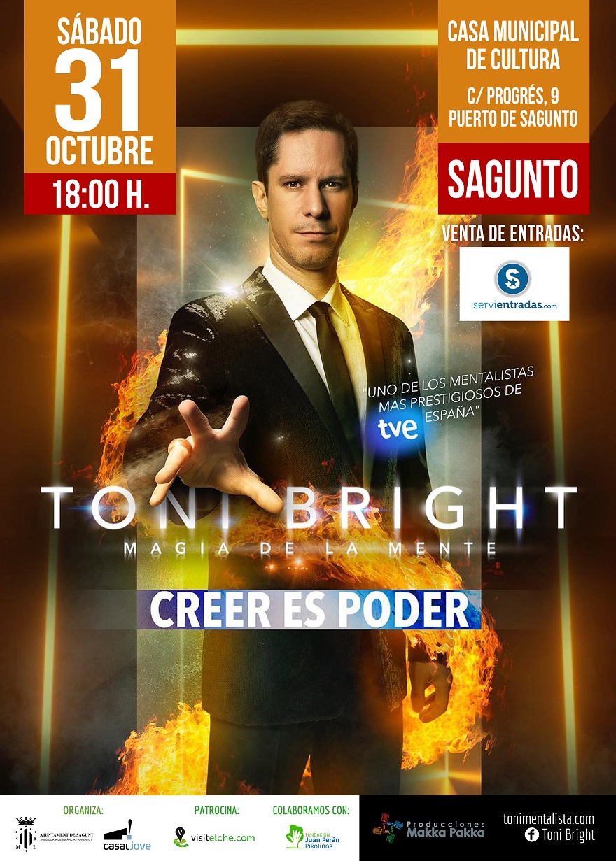 La Casa de Cultura de Puerto de Sagunto acogerá el 31 de octubre, a las 18.00 horas, el nuevo espectáculo de Toni Bright, el mejor mago y mentalista de España con Creer es poder. Una experiencia increíble con un nuevo espectáculo por descubrir. En este caso el espectáculo estará dirigido a público familiar y a mayores de 7 años. Las entradas se pueden adquirir en www.servientradas.com.