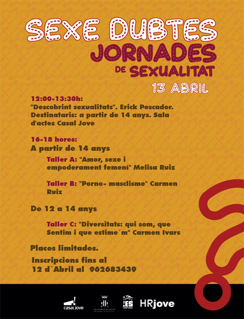 El Casal Jove acogerá el próximo sábado, 13 de abril de 12 a 18 horas, las jornadas sobre sexualidad ‘Sexedubtes’, una iniciativa promovida por los Corresponsales de los Institutos de Educación Secundaria (IES) y el grupo HR Jove y organizada por la Concejalía de Juventud. Estas jornadas, con plazas limitadas, están dirigidas a jóvenes de 12 a 18 años.