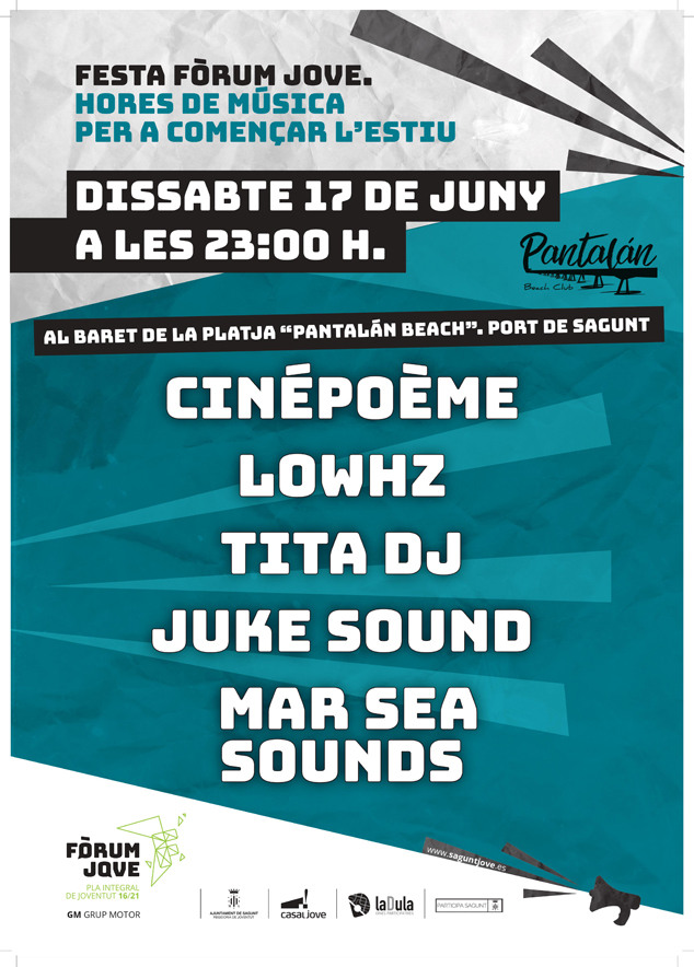 Seguidamente, a partir de las 23 horas también en el chiringuito Pantalán Beach, tendrá lugar el evento Horas de Música para empezar el verano, con el objeto de cerrar de manera festiva a esta última parte del proceso que está a punto de concluir, y que lo hará con la aprobación, en los próximos meses, del Plan de Juventud por parte del Pleno municipal. En la fiesta participaran disyoqueis de la talla de Mar Sea Sounds, Juke Sound, Tita Dj, LowHZ y Cinépoème representando estilos diversos para todos los gustos.