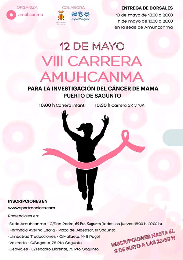 Las inscripciones se pueden realizar hasta el 8 de mayo a través de la web www.sportmaniacs.com o presencialmente los martes y jueves de 18 a 20 horas en la sede de AMUHCANMA (c/ San Pedro, 65 el Puerto de Sagunto).