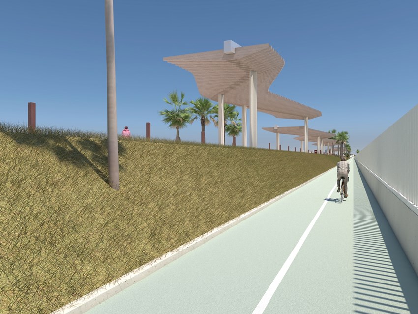 El proyecto contempla soluciones constructivas con varias áreas como: Glorieta y entronque con la calle Travesía del Mediterráneo y Paseo Marítimo; Escaleras de acceso y zona de inicio del paseo; Parte central del paseo y espacio de actividades; Zona final del paseo y futuro enlace con el pantalón; Zona de interacción con la playa; Zona del carril bici.