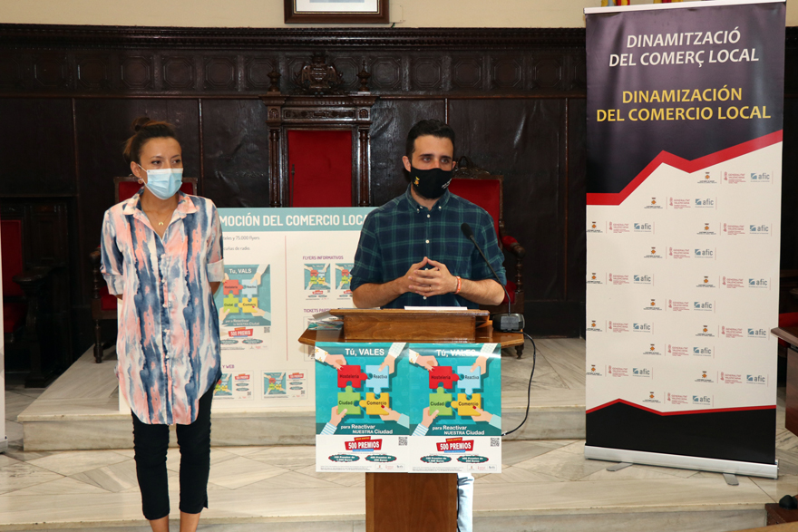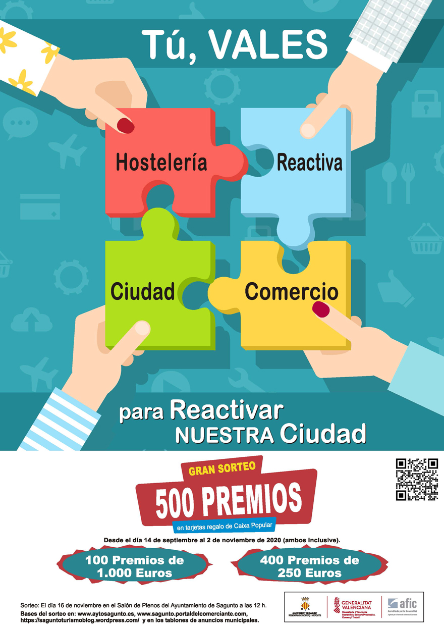 El Ayuntamiento de Sagunto, a través de la concejalía de Comercio y Mercados, ha lanzado la Campaña de Dinamización del Comercio y la Hostelería ‘Tú vales para reactivar nuestra ciudad’ que sorteará 500 tarjetas regalo por un valor total de 200 000 euros entre la ciudadanía que del 14 de septiembre al 2 de noviembre haga sus compras en los cerca de 200 establecimientos de la ciudad que se han adherido a la campaña.
