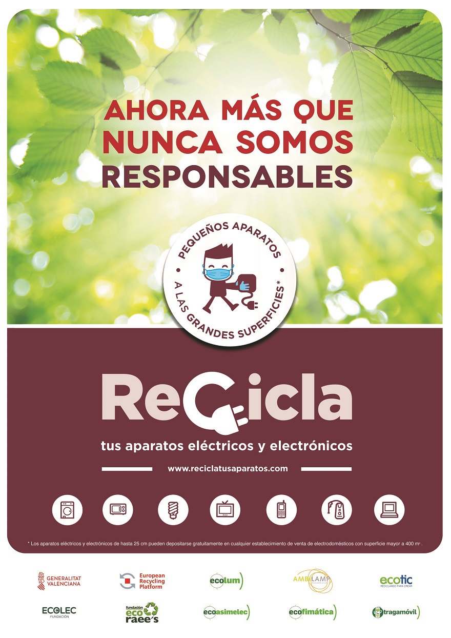 La campaña ‘Recicla tus aparatos’ alcanza su 4ª edición y está impulsada por la Generalitat Valenciana, a través de la Conselleria de Agricultura y Medio Ambiente, en colaboración con las mayores plataformas del sector, tales como Recyclia (Ecopilas, Ecofimática, Ecoasimelec y Tragamóvil), Ecolec, Ecotic, Ambilamp y Ecoraees.