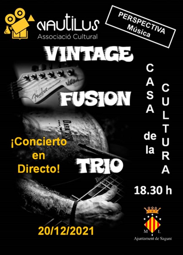 Esta tarde la Casa Municipal de Cultura de Puerto de Sagunto acoge a las 18:30 horas la última actividad que organiza la Asociación Cultural Nautilus este año 2021. Esta vez se trata de una actuación de música en la que el público podrá disfrutar de un concierto en directo de la banda local Vintage Fusión Trío (VFT), formada por Quique Rondán (batería), Juan Carlos Fuentes (guitarra) y José Manuel Solis (bajo).