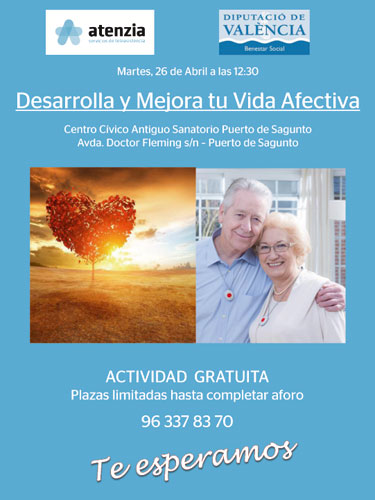 El Salón de Actos del Centro Cívico “Antiguo Sanatorio” de Puerto de Sagunto acogerá el próximo martes, 26 de abril, a las 12.30 horas, una charla organizada por la empresa de Teleasistencia de la Diputación de Valencia, bajo el título “Desarrolla y mejora tu vida afectiva”, dirigida a personas mayores. Está previsto que acuda la diputada de Acción Social, Mercedes Berenguer.