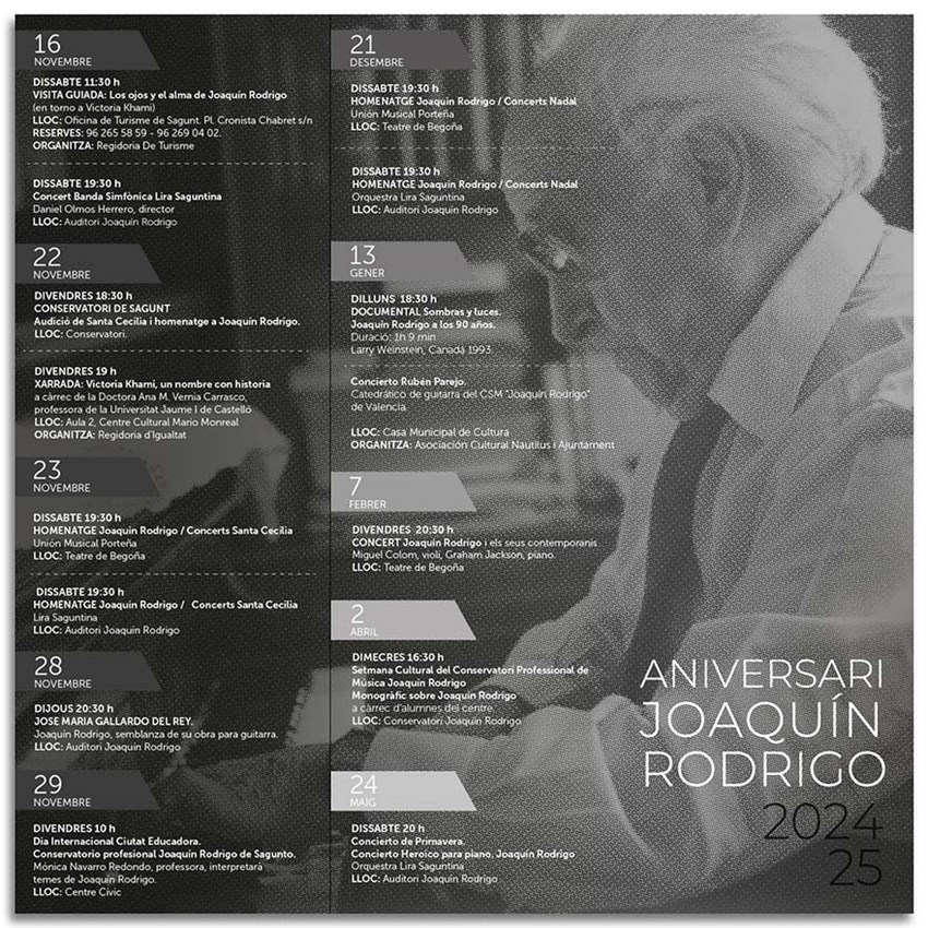 Las actividades de 2025 comenzarán el lunes 13 de enero con el concierto de Rubén Parejo Shadows and Light. Joaquín Rodrigo at 90. Este evento musical organizado por la Asociación Cultural Nautilus comenzará a las 18 horas en la Casa Municipal de Cultura de Puerto de Sagunto.