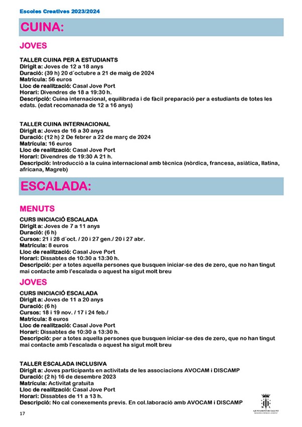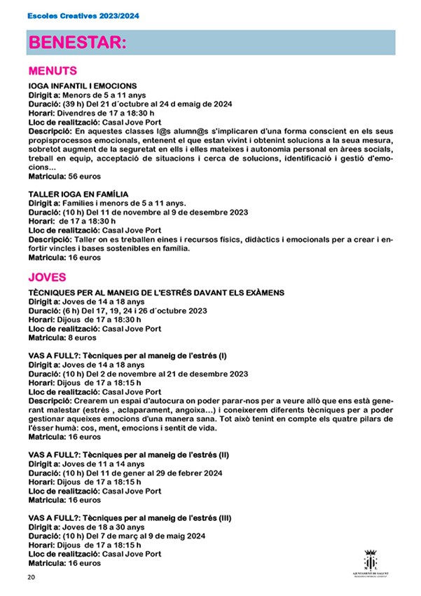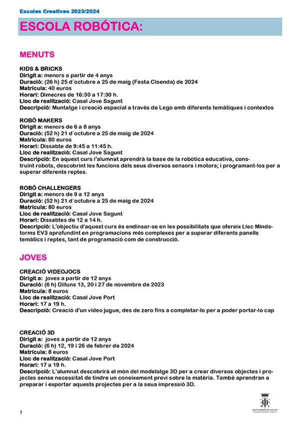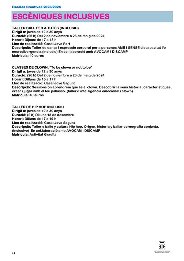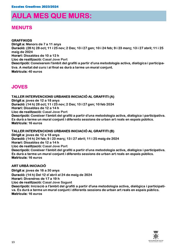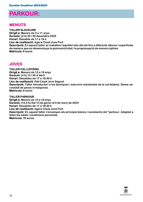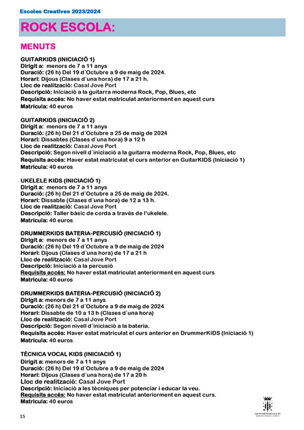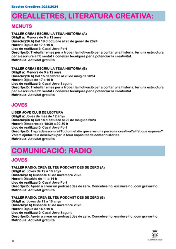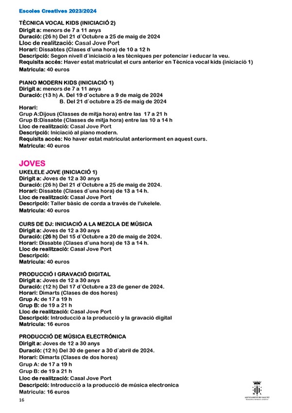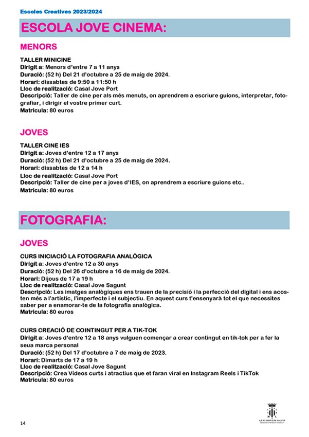 La nueva edición de escuelas creativas organizadas por la Concejalía de Juventud e Infancia del Ayuntamiento de Sagunto comenzará su periodo de inscripción el 1 de septiembre y estará abierto hasta el 1 de octubre, excepto el Aula de Teatre Jove, que será del 1 al 27 de septiembre de 2023, y sus cursos tendrán lugar del 16 de octubre al 25 de mayo.
