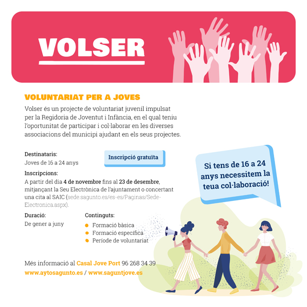 La concejalía de Juventud e Infancia del Ayuntamiento de Sagunto ha impulsado el proyecto de voluntariado juvenil Volser. Este proyecto va destinado a jóvenes de 16 a 24 años que tendrán la oportunidad de participar y colaborar con las diversas asociaciones del municipio ayudando en sus proyectos.