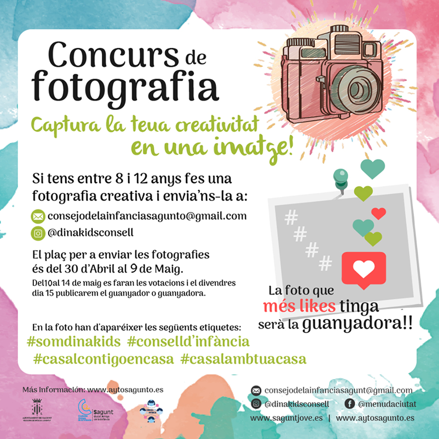 Para participar hay que enviar las fotografías a consejodelainfanciasagunto@gmail.com o por privado a @dinakidsconsell hasta el 9 de mayo. Del 10 al 14 de mayo las fotografías se publicarán en las redes sociales de Juventud e Infancia y la que más ‘me gusta’ tenga será la ganadora que se dará a conocer el 15 de mayo y tendrá premio. También se puede participar publicando la fotografía en el perfil del participante con las etiquetas #somdinakids #conselldinfància #casalcontigoencasa #casalambtuacasa, siempre y cuando el perfil no esté en privado.
