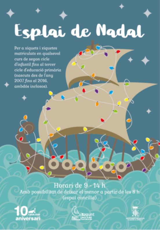 Este programa nace de la importancia de dotar de contenido el tiempo libre de la infancia durante las vacaciones de Navidad. Va dirigido a los nacidos desde 2007 hasta 2016, ambos incluidos. Existen dos opciones de cuatro días: opción A, los 23, 24, 26 y 27 de diciembre de 2019; opción B, los 30 y 31 de diciembre de 2019, y 2 y 3 de enero de 2020. El horario será de 9.00 a 14.00 horas, pero gracias al Esplai Concilia, existe la posibilidad de dejar a los menores en las instalaciones a partir de las 8.00 horas.