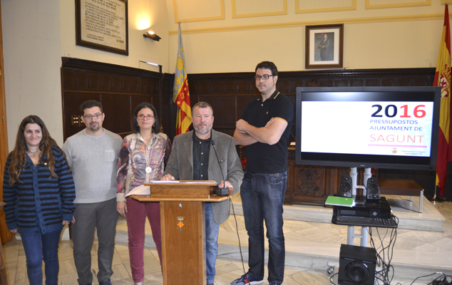 El alcalde y concejales del Equipo de Gobierno (C.Compromís, EU y ADN Morvedre) en la rueda de prensa de presentación de la propuesta de presupuesto (17-12-2015)