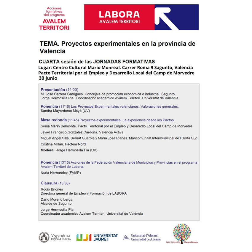 El próximo jueves 30 de junio, el Centro Cultural Mario Monreal acoge la cuarta sesión de las jornadas formativas que organiza LABORA, dentro del Plan Avalem Territori, en colaboración con el departamento de Promoción Económica e Industrial del Ayuntamiento de Sagunto, enmarcada en el Pacto Territorial por el Empleo y Desarrollo Local del Camp de Morvedre. El tema a tratar en esta sesión es ‘Proyectos experimentales en la provincia de Valencia’.