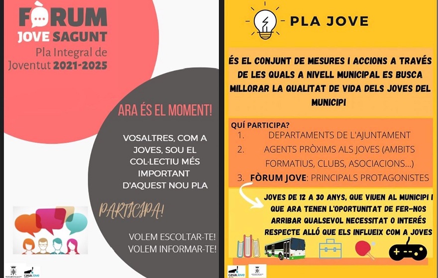 El Departamento de Juventud e Infancia del Ayuntamiento de Sagunto está llevando a cabo el proceso inicial del nuevo Pla Jove 2021-2025. Se trata de un proyecto destinado a la búsqueda y mejora de la calidad de vida de la juventud, a través de medidas y acciones municipales desarrolladas a partir de necesidades y propuestas recabadas por diferentes departamentos del Ayuntamiento que forman la Comisión Técnica.