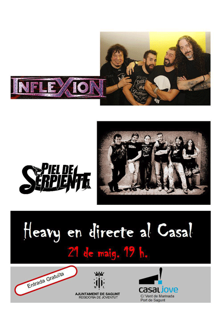 El sábado, 21 de mayo, a las 19 horas, será el turno de la música en directo con el concierto de los grupos de heavy Inflexion y Piel de Serpiente.