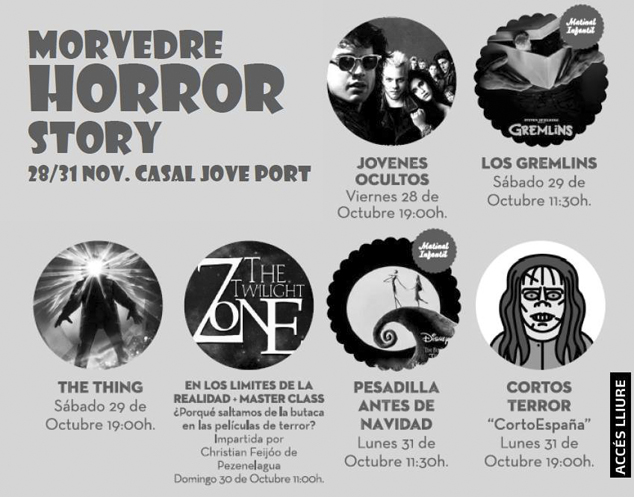 La delegación de Juventud del Ayuntamiento de Sagunto ha preparado una variada oferta de actividades para que todos los que lo deseen puedan disfrutar como nunca de la fiesta de Halloween desde el viernes hasta el lunes. Cuatro días con iniciativas dirigidas a público de diferentes edades, aunque algunas de ellas, como la del ciclo de cine, el Morvedre Horror Story, es para todos los públicos que podrán disfrutar de películas clásicas de terror de los años 80 desde el viernes hasta el mismo lunes.